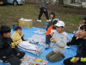 焼き上がった「おいも」を頬ばる子どもたちの顔は、どれも満面の笑顔。